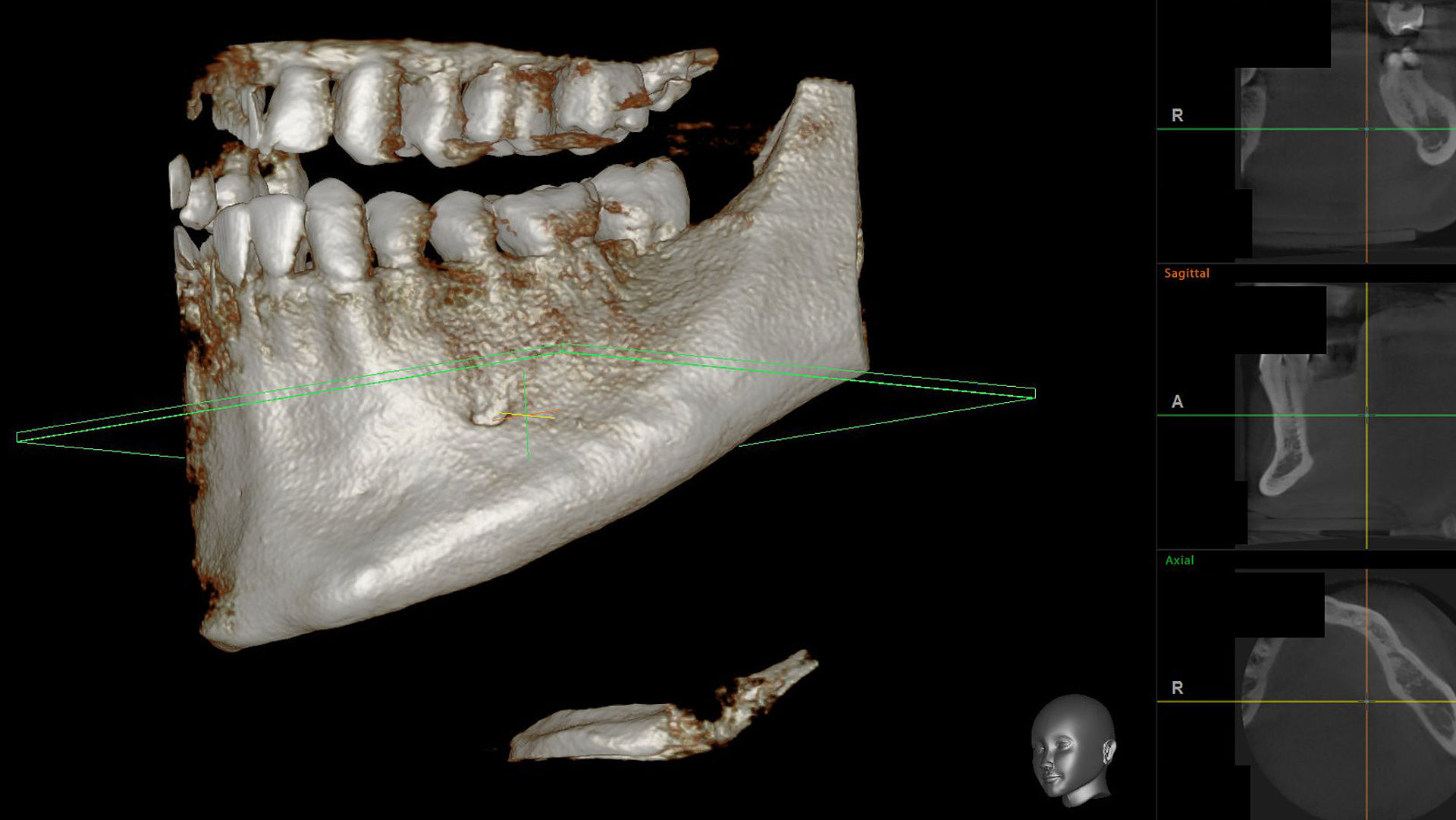 Mit Hilfe eines digitalen Volumentomographen können wir detaillierte Abbildungen der Gesichts- und Kieferknochen in höchster Auflösung erstellen. Die Strahlenbelastung ist dabei im Vergleich zur herkömmlichen Computertomographie sehr gering. Die 3D Darstellung ermöglicht es uns, Operationen, Rekonstruktionen und Implantationen computergestützt am Bildschirm zu planen. Für den Patienten bedeutet das: weniger Belastung und ein präzises Ergebnis. Die Aufnahme ist jederzeit digital in der Patientenakte verfügbar und kann an Ihren Zahnarzt übertragen werden.